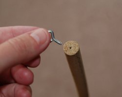 1. Using a dremel tool or a drill with a small drill bit, drill a small hole on one end of each dowel stick. Then screw the eyelet loops into the holes.