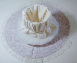 3. Prepare your 12 inch circle of fabric. The lace trim can be sewed on, or glued on. Or, if you prefer, skip the lace trim and cut the fabric with some pinking shears for a nice trim without the hassle. Also prepare the 6 inch diameter piece of batting.