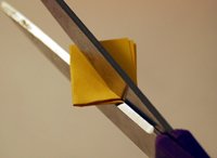 5. To make the beak, take a small square of yellow or orange card stock and fold it into quarters. Then, cut off a triangle, with one edge along the fold (see photos). Open up the card stock, and then cut the resulting diamond in half. This becomes the beak, and it can be glued on as shown.