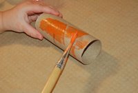3. Next, glue the toilet paper roll to the bowl. This will be the turkey's head and neck. Glue it so that the bowl will stand up when the toilet paper roll is attached. Since some brands of paper bowls may weigh differently, so be sure to test this out to be sure the turkey will stand stable and will not tip over. Allow to dry.