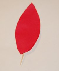 9. To make the feathers, stack a few sheet of colored card stock on top of one another, then fold them in half. Cut out a feather shape. You will end up with duplicate feather shapes for each color. Apply glue to one whole side of the feather, then add a toothpick near the bottom, with half of it hanging out. Then apply the other side of the feather, so the toothpick is “sandwiched in”. Allow to dry.
